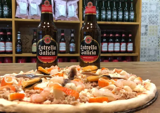 Tomate, mozzarella, atún, surimi, anchoas, gambas, mejillones y orégano