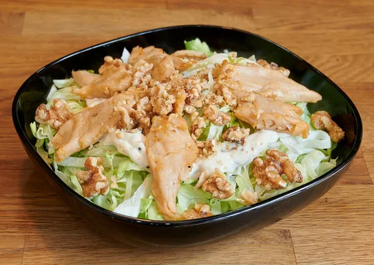 Salsa César vegana, lechuga, no pollo empanado, cheddar vegano.