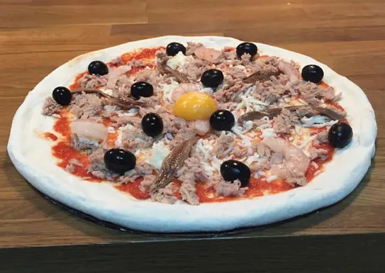 Tomate, mozzarella, atún, anchoas, gambas, aceitunas negras, huevo y orégano.